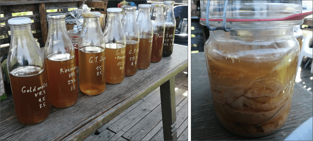 Am Samstag, 11. Mai hat Marco Schernthanner seine Erfahrungen zum Thema Kombucha mit den Kursteilnehmer:innen geteilt. Bei Kombucha handelt es sich um ein fermentiertes Getränk, das aus Tee, Zucker und einer Starterkultur (SCOBY – symbiotische Kultur aus Bakterien und Hefen) hergestellt wird. Nachdem die Zubereitung exemplarisch vorgezeigt wurde, durften wir verschiedenste Ansätze von Marco verkosten. Dabei kann je nach Ausgangsmaterial und Fermentationsbedingung ein unterschiedliches Mundgefühl erzielt werden. Das Spektrum umfasst dabei alle Geschmäcker von süßlich-mild bis prickelnd-sauer. Jede:r Kursteilnehmer:in erhielt zum Schluss eine SCOBY-Starterkultur, um zuhause selbst Kombucha-Getränke kreieren zu können.