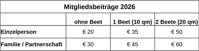 Unsere Beete sind 10 qm groß und kosten € 15.- pro Jahr. Die Beete werden nach dem first-come-first-serve-Prinzip vergeben, wobei bestehende Mitglieder im nächsten Jahr ein Vorrecht auf das von ihnen bewirtschaftete Beet haben.